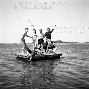 # 56 – Czerwone Gitary 1966r. (Na tratwie z modelką)Od lewej Krzysztof Klenczon, Seweryn Krajewski, Jerzy Skrzypczyk, Bernard Dornowski, Jerzy Kossela